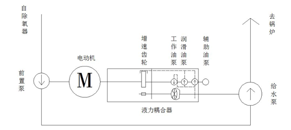 系統由前置泵、電動(dòng)機、液力偶合器(包含工作油路、潤滑油路部分)、給水泵組成,系統根據機組負荷變化,通過(guò)液力偶合器調節給水泵供水量的大小,以滿(mǎn)足鍋爐生產(chǎn)系統供水量的需要。