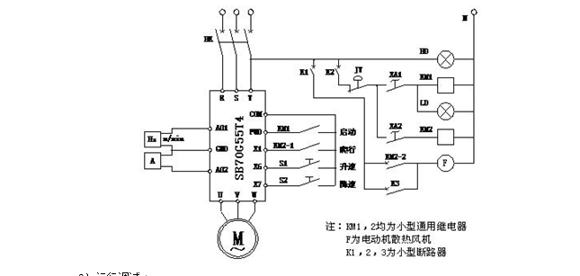 將其中的一臺直流電機改為二臺交流電機傳動(dòng),對普通鼠籠式電動(dòng)機進(jìn)行速度調節控制,根據變頻器輸出端口重新配置現場(chǎng)操作臺速度及電流顯示,利用原有控纜進(jìn)行分離連接控制。根據實(shí)際負載情況的測算,擬配置一臺SB70G55T4變頻器,一臺Y-280M6/55kW電動(dòng)機。